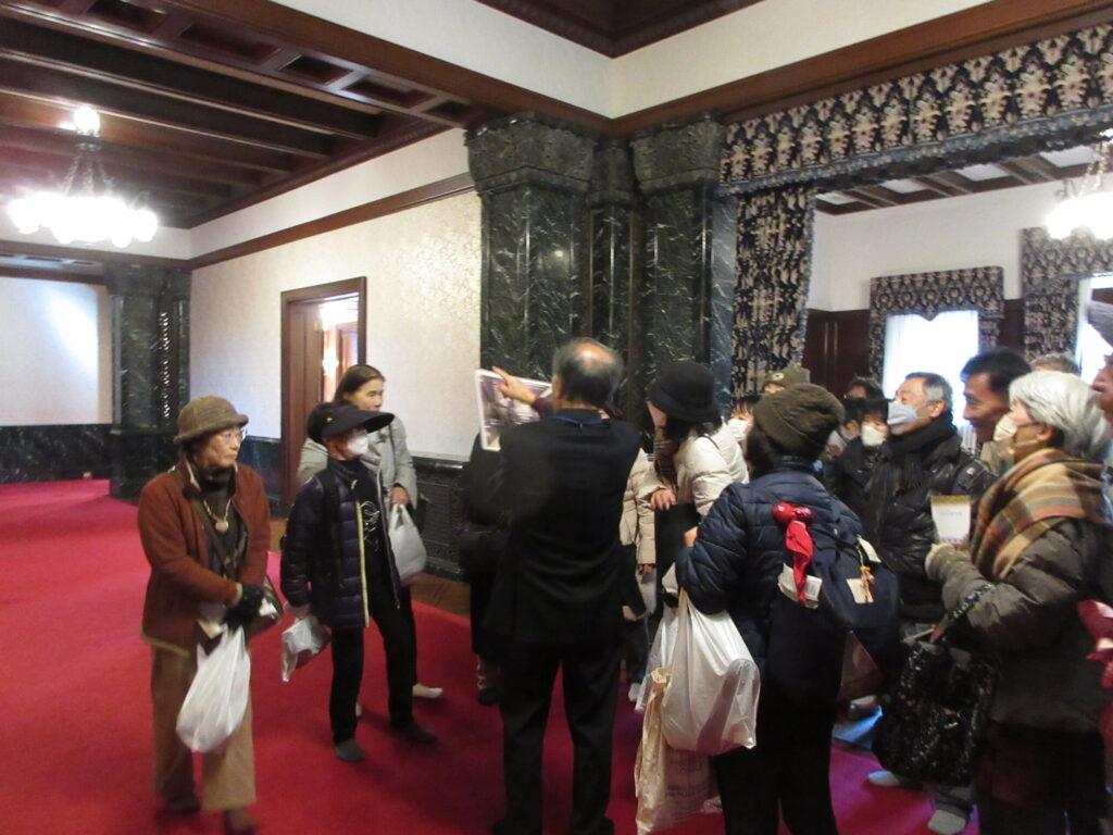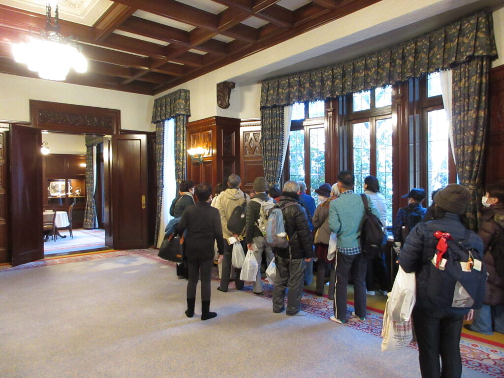前田邸では、ABC3班に分かれて、ガイドさんの案内で、昭和初期の和洋建築の粋を集めた和館と洋館を見学し、素晴らしい建物、調度品などを隅々まで堪能することができました。