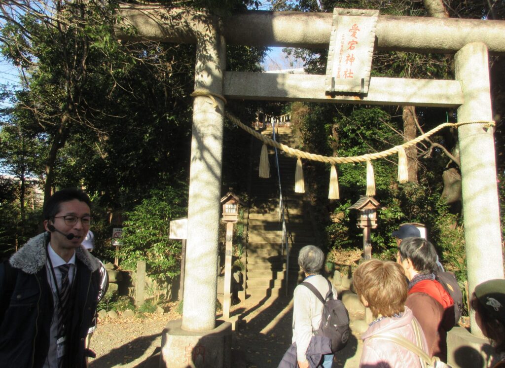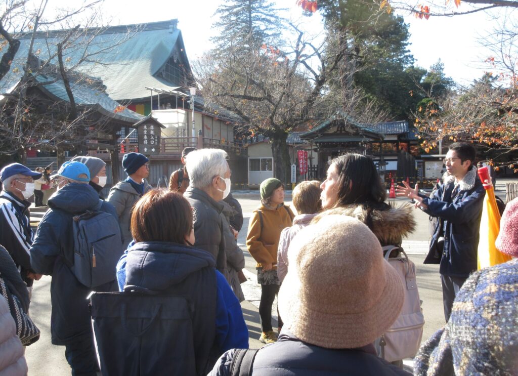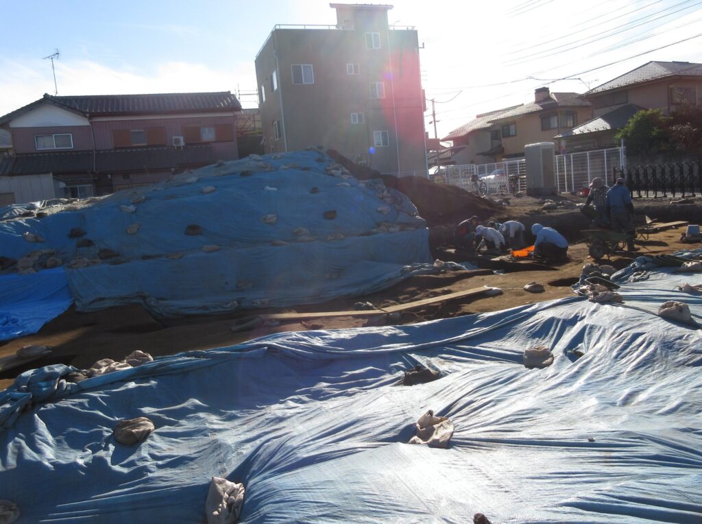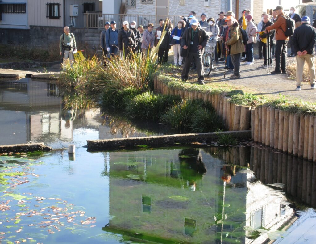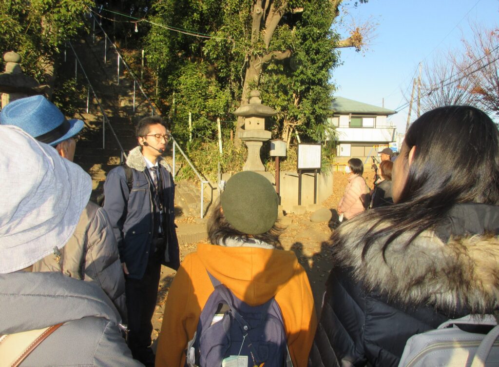 午後の現地学習は仙波古墳群見学です。喜多院に集合し、慈眼堂古墳や多宝塔古墳の話からスタートです。仙芳真人入定塚から三変稲荷神社古墳へ歩き、方墳の周りを巡りました。ここから龍池弁才天に向かうルートを一部変更して、弁天南遺跡の発掘調査現場を見学しました。普段見ることのない現場を見られて感嘆の声が上がっていました。龍池弁才天の下にある双子池とよばれる湧水池は川越台地の段丘崖にあり、地形的に湧水が出やすく市内としては豊富な水量があるとのことでした。次の長徳寺は川越台地の東端の高台に位置し居館の立地条件としては好立地であり、周辺の小字名からも仙波氏居館の存在を窺える条件がそろうことから仙波氏館跡に比定される地です。ここで小休止して仙波氷川神社に向かう。境内の塚が古墳か否か疑問が呈されていますが、氷川神社古墳とされているとのことでした。次の仙波河岸史跡公園では仙波河岸跡や昔の姿に再現されている「仙波の滝」を見た後、急な崖を上ると愛宕神社古墳に到着です。次に訪ねる浅間神社古墳と共に大型の円墳で父塚、母塚と並び称されていますが、いずれが父塚か母塚なのか今では特定できないとのこと。浅間神社古墳を見学して今回の現地学習を終了しました。
