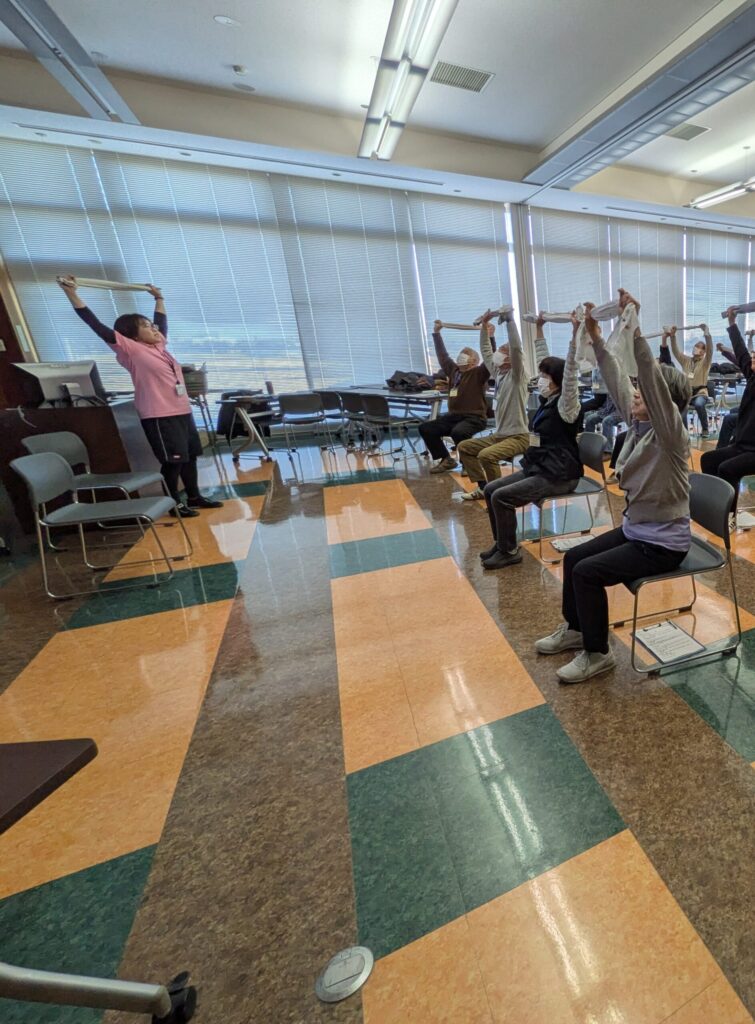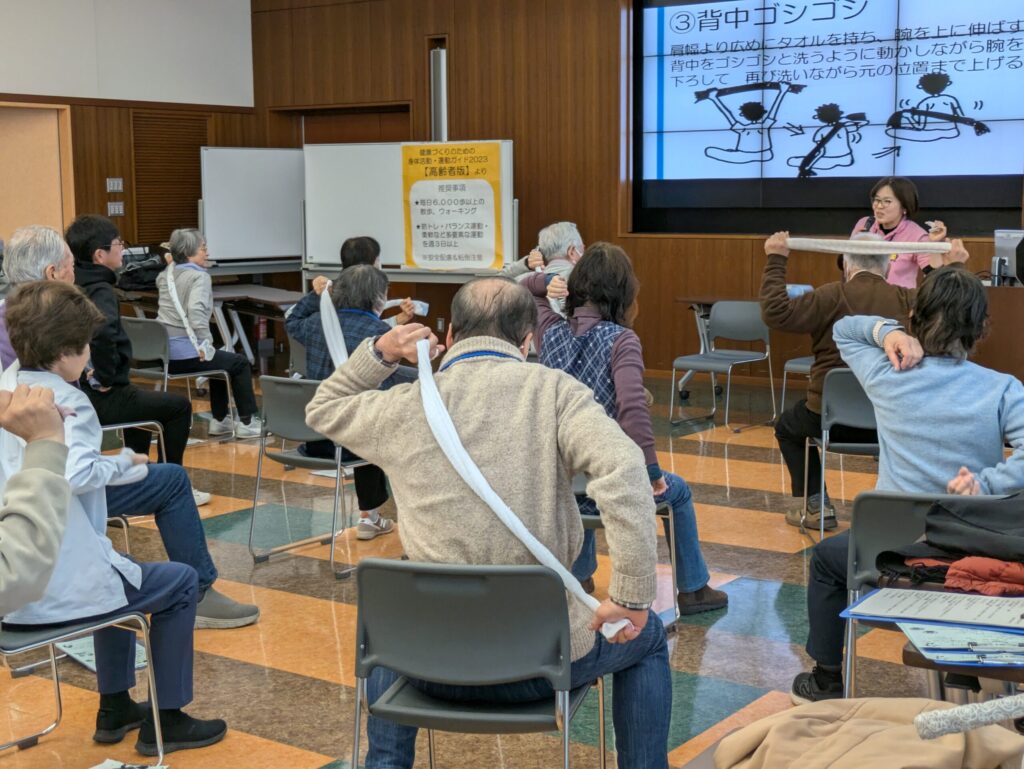 「ロコモティブシンドローム」や「フレイル」にならないよう、実際に講師の動きを見ながらタオルを使い全員で健康体操を行いました。