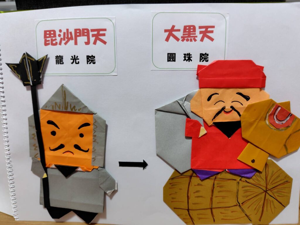 毘沙門天はインドの神様で、甲冑をつけ、左手に宝塔、右手に槍を持っています。